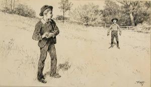 Two boys playing ball in field