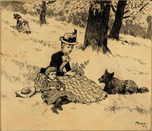 Woman, child and dog resting in grass beneath trees