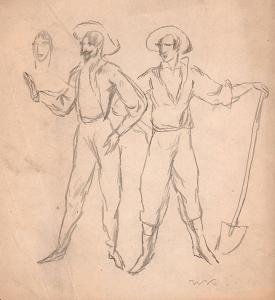 [Two standing men, one with a shovel]