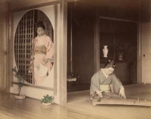 Two women, one playing koto