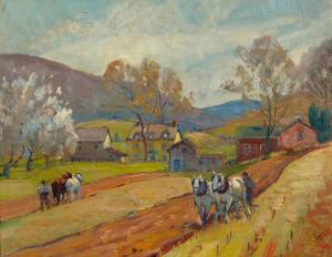 [Landscape with farmers plowing]