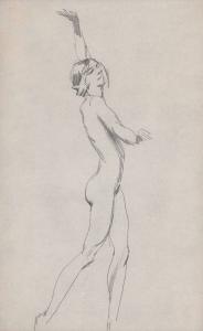 [Standing female nude with arm upstretched]