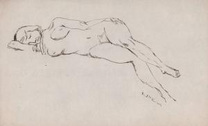 [Reclining nude woman with left hand on hip]