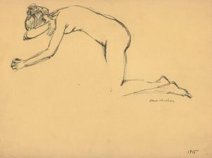 [Kneeling nude woman with right arm covering face]