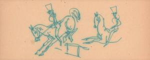 [Two circus performers on horseback, one horse jumping over hurdle]