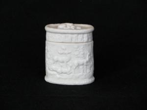 [Lidded oval-shaped box with hunting scene on sides]