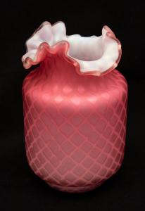 [Pink cylindrical vase with ruffled tricorn lip]