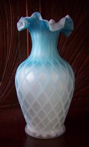 [Blue and white vase with tapered neck and ruffled tricorn lip]