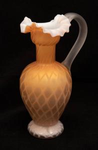 [Orange ewer with ruffled tricorn lip and clear handle]