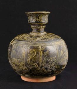 [Incised vessel, bag form with zoomorphic and floral incised reserves, turned neck]