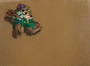L19. Goofy in green garb with green hat with purple feather, holds a broken stick above his head (4)