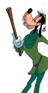 L19. Goofy in green garb with green hat with purple feather, holds a broken stick above his head (4)