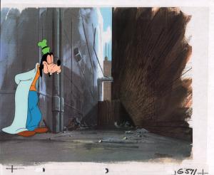 L19. Goofy in green garb with green hat with purple feather, holds a broken stick above his head (4)
