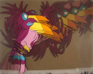 L19. Goofy in green garb with green hat with purple feather, holds a broken stick above his head (4)