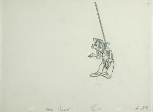 L19. Goofy in green garb with green hat with purple feather, holds a broken stick above his head (4)