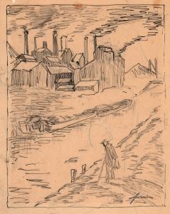 Man with cane, factory in background