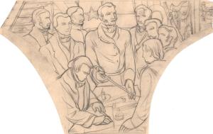Mural Sketch, group gathered around table with central figure holding a drawn sword (surrender scene?)