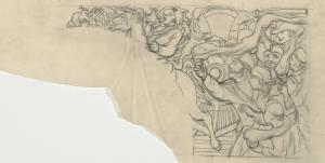Mural Sketch, horse and rider, train, mob scene