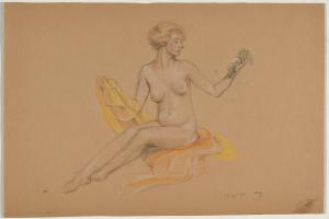 [Study, seated nude with drape, holding grapes]