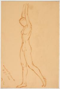 [Study, standing nude, arms stretching up]