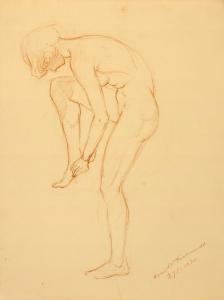 [Study, nude posed “tying shoe”]