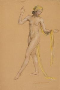 [Study, standing nude wearing yellow scarf on head]