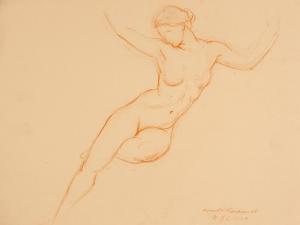 [Study, seated nude leaning right with arms raised]