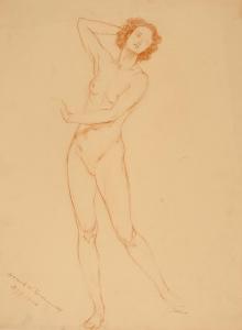 [Study, standing nude, arm up behind head]