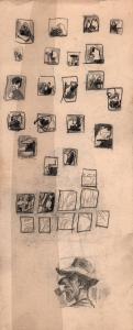 untitled, thumbnail sketches, 29 square shapes filled with nondescript objects and 1 square of the profile of man wearing hat and smoking a pipe [Ellis 50(2)]