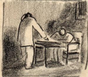 untitled, figure sitting at desk with another figure standing at end of desk [Ellis 52(7)]