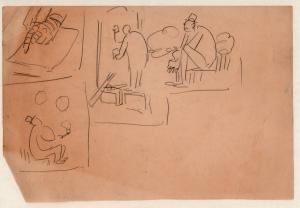 untitled, thumbnail sketches, one of seated man looking at bubbles rising from pipe [Ellis 62(1)]