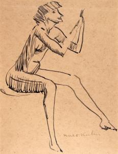 [Seated nude female with arms bent at elbows]