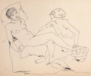 [Two nude women, one reclining and one seated with fruit basket]