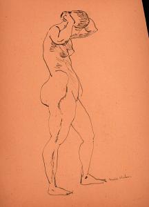 [Standing nude woman in profile with hands behind head]