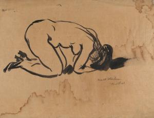 [Kneeling nude figure, bent forward with their hands and head on ground]