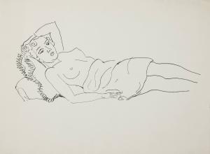 [Topless woman reclining on pillows]