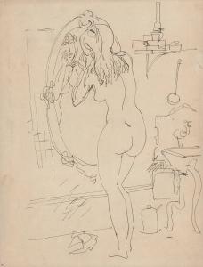 [Nude woman in bathroom standing in front of mirror]