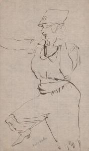 [Study of a woman with hat and right hand outstretched]