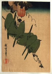 untitled [seven little green birds, perched together]