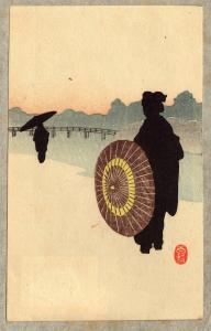 untitled [silhouette figures, women with umbrellas walking along river bank]