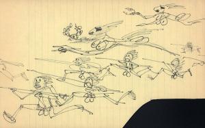 (29) untitled [sketch, several running male nude figures carrying spears, two flying female figures carrying laurel leaf crowns]