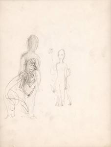(44) untitled [sketch, two false front figures with figures hiding behind each, carrying knives]