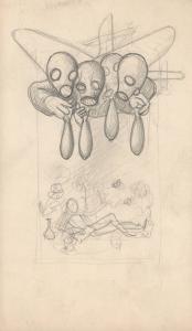 (110) untitled [sketch, four figures flying in plane wearing gas masks preparing to drop bombs on picnicking figure below]