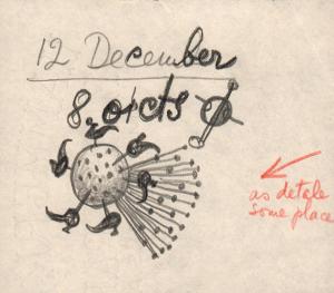 (218) untitled [sketch, fantastical mechanism - round “body” with shoes and a bristly tail]