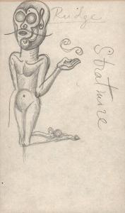 [Sketch of kneeling nude figure with mask/helmet-like head]