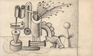 [Sketch of dinosaur-like creature with geometric-shaped machine]