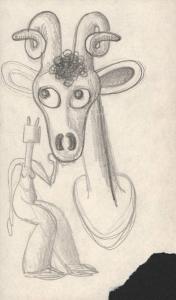 (312) untitled [sketch, goat head and figure with electric adaptor for a head; verso sketch of creature with tall curled horns]