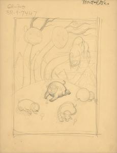 (321) untitled [sketch, three long necked creatures peering over hilltop at four small roly-poly creatures sniffing flowers; verso, pencil sketch.]