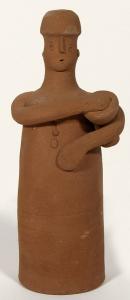 [Votive figurine with conical-shaped body, carrying a vessel]