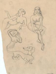 (71) untitled [sketch, three nudes (female) and a dog (dachshund)]